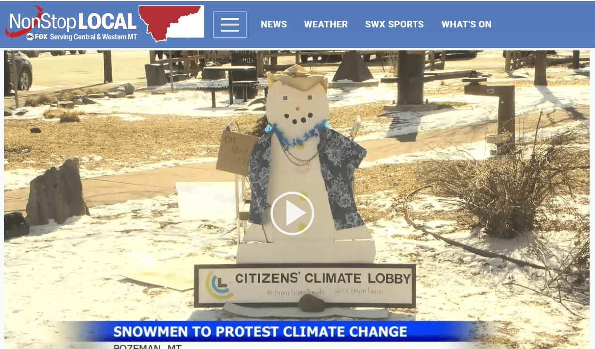 Sunday, Feb 11, Bozeman: Join the Fun & Free "Save Our Snow Festival" hosted by the Bozeman Chapter of Citizens’ Climate Lobby (CCL). This engaging and informative event will be held at the Bozeman Public Library on Sunday, Feb. 11, from 1-3 pm. Meet our inspiring CCL regional Director Bill Barron, dive into effective bipartisan climate solutions trivia style, and participate in delightful family crafts and games. Outside, young and old can build mini snow folks complete with signs like ‘Global Warming is sno laughing matter!’ Then take a photo to send to our Congressmen! It's a perfect blend of fun and advocacy! And of course there's hot chocolate! RSVP on Facebook. See more on our Chapter page.